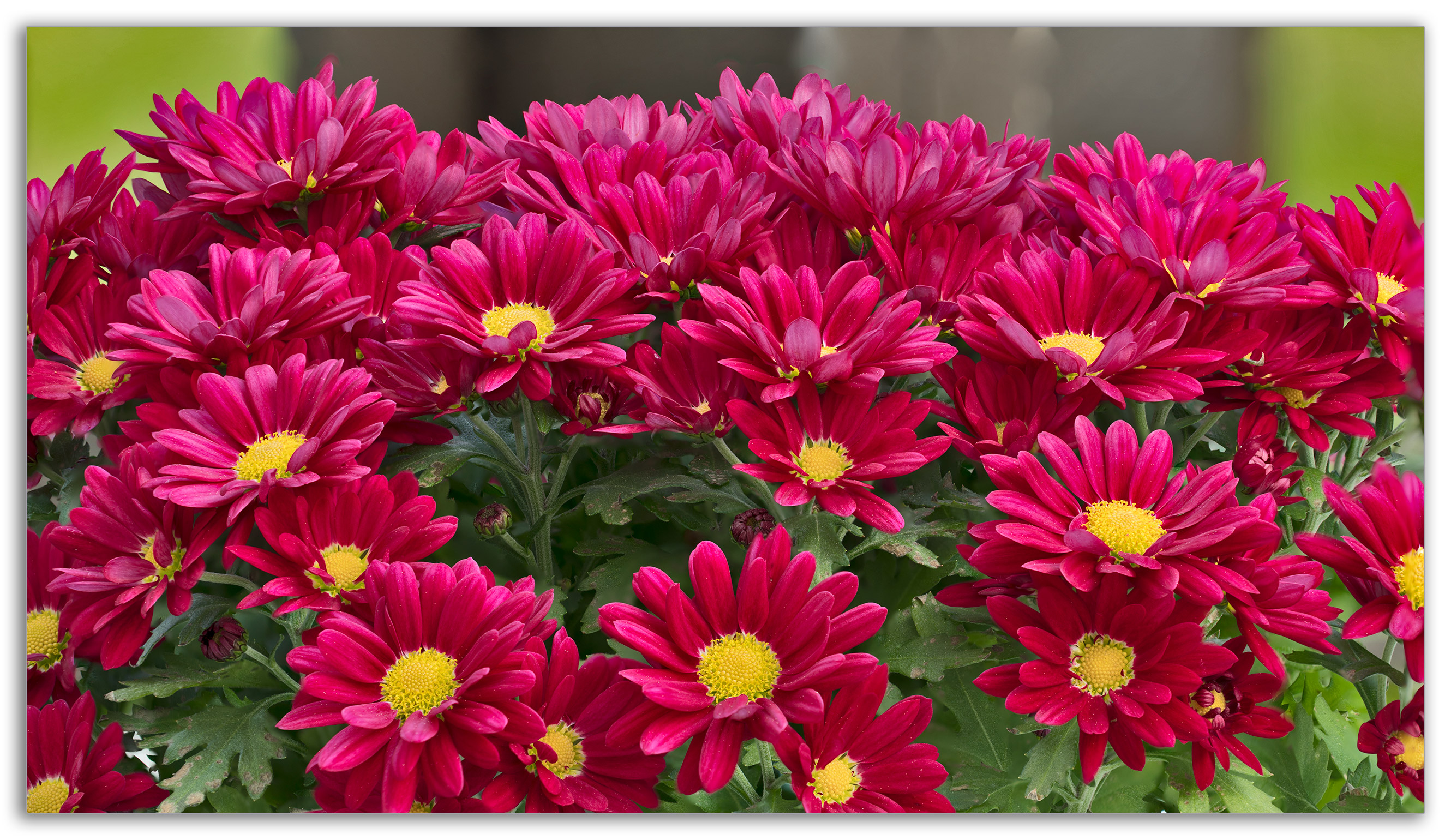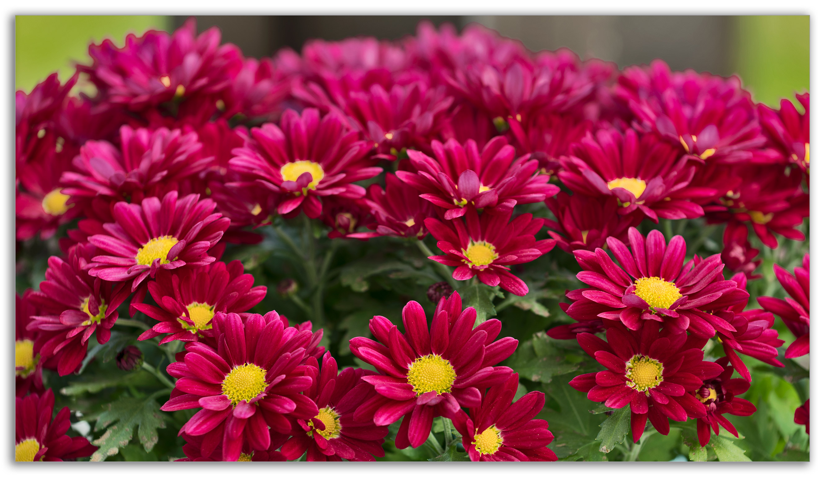 You have a flower pot full of flowers and it is about 14 inches in diameter. You want all the flowers in focus and sharp, but not the fence and railing behind the flower pot.
