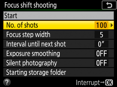Important Note: If “Focus shift shooting” is grayed out in your menu and you get an error message, it means you have Auto bracketing or Multiple exposures active—turn them off.