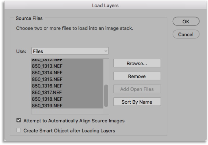 I check the box to Attempt to Automatically Align Source Images as that will save having to do that later. Do not check Create Smart Object… Click OK.